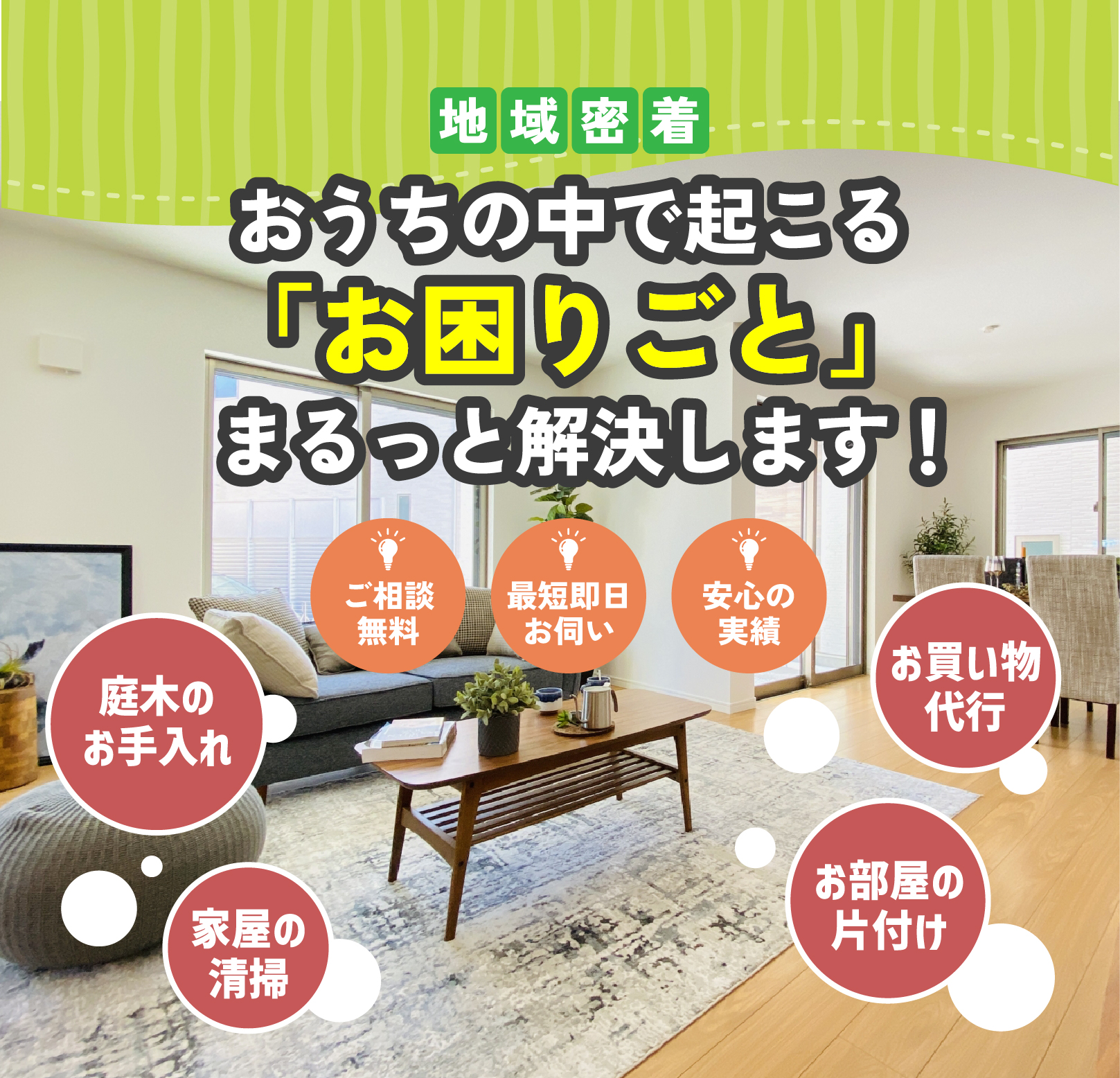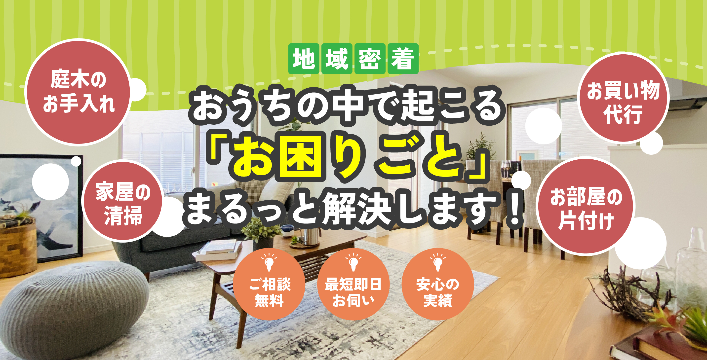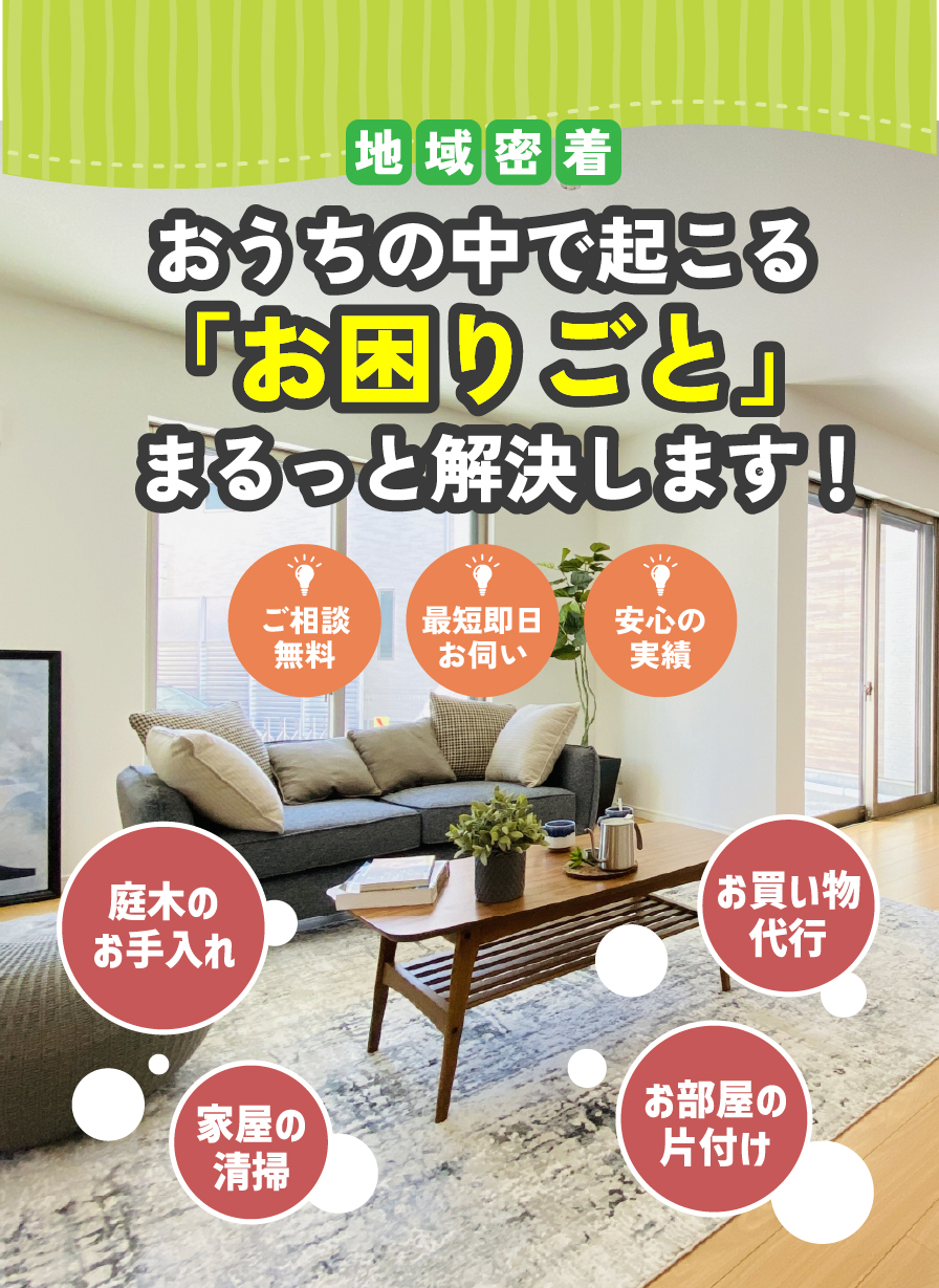 地域に密着している御用聞き事業ならでは!お電話を頂いてから、最短即日お伺いが可能です。突発的に起こる様々な「おうちのお悩み」に、すぐに対応することが可能です!
